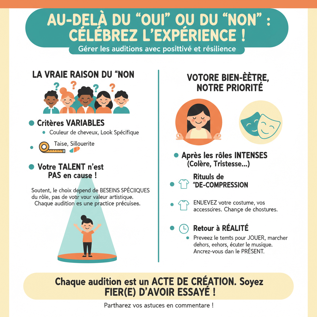 Un échec en audition peut être difficile. Votre rôle est de valoriser le plaisir de l'expérience plutôt que le résultat. Expliquez que ne pas être retenu est souvent lié à des critères physiques (taille, couleur de cheveux) et non à son talent ou sa valeur.